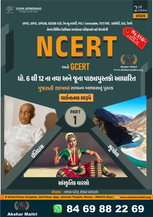 📱 Remarks : આ પુસ્તકમાં NCERT દ્વારા વર્ષ 2024 માં ધોરણ ૬ અને વર્ષ ૨૦૨૫ માં ધોરણ ૮ ના પ્રકાશિત કરમાવા આવેલ નવા સામાજિક વિજ્ઞાન ના પાઠ્યપુસ્તકોનો સમાવેશ કરવામાં આવ્યો છે.